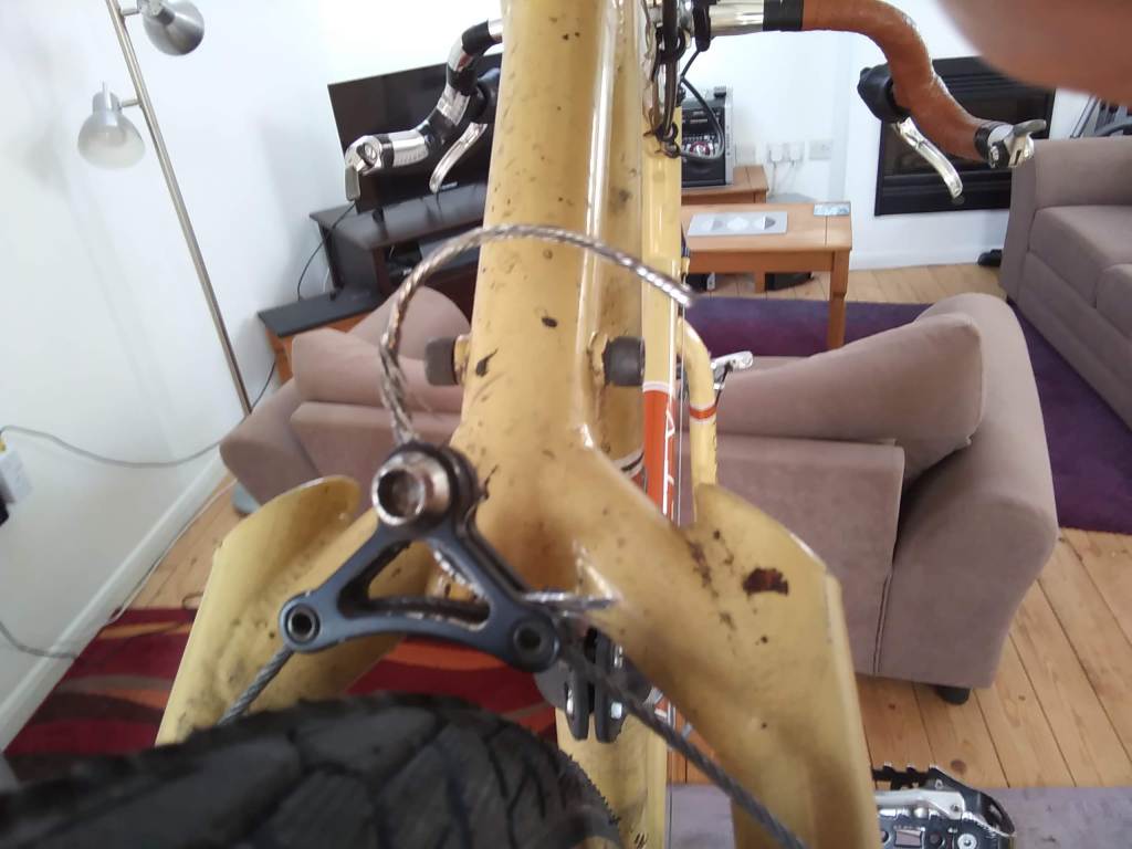 Next I really needed to sort out my rear brake. A cantilever brake which was not working very well. The pivots where the brakes are attached to the frame were moving freely, but the cable didn’t seem to be running smoothly and was horribly frayed at the end. As was the straddle cable. The seat post cable hanger had a seized barrel adjuster. The brake cable housing was taped to my frame, rather than running through the frame mounts. I also had well worn bar tape and as I would be removing it to access the rear brake cable, it would be a good time to replace it.