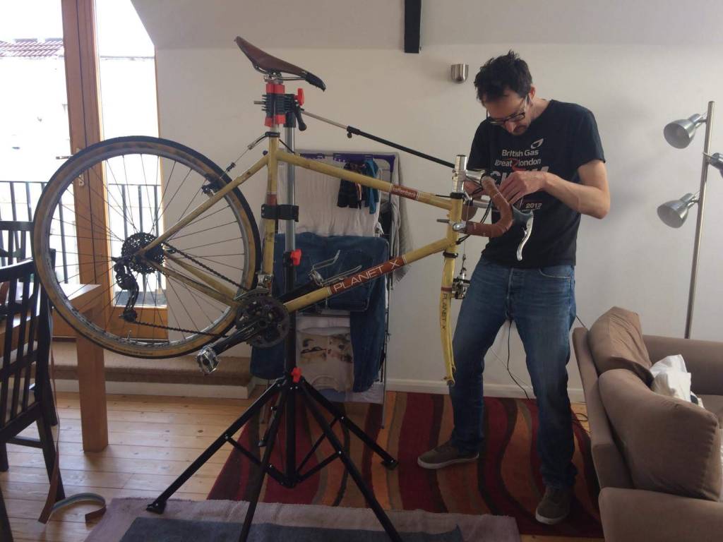 To start off, I put an old rug down, then laid the Finish Line Absorb-It Mat over the top. Then I setup my Aldi Bikemate Bike Repair Stand. I popped out the front wheel then carried my bike up to the lovely, bright, spacious work area I had created in the living room.